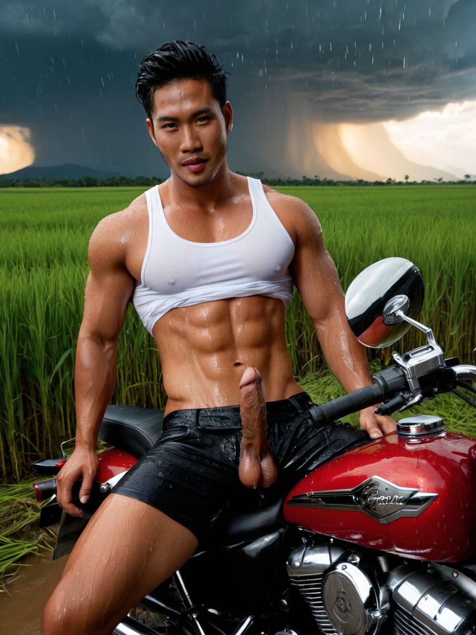 ผมขึ้นซ้อนท้ายเขารู้สึกถึงความร้อนจากแผ่นหลังกำยำที่เปียกฝนและเหงื่อชุ่มฉ่ำกลิ่นเหงื่อชายดิบเถื่อนผสมกลิ่นฝนลอยคลุ้งหนักหน่วง ระหว่างทางฝนยังกระหน่ำไม่เลิก ถนนลูกรังเจ้ากรรมทำเอาผมเกือบตกมอเตอร์ไซด์ “พี่กอดผมมาเลยครับ ฝนตกแบบนี้เดี๋ยวจะลื่นตกไปซะก่อน ผมไม่มีเงินพาไปโรงพยาบาลนะครับ”เสียงฝนกระทบหมวกกันน็อกดังเปาะแปะๆ ราวกับเสียงไข่ตีกระทบแก้มตูดผมกอดเอวเขาแน่นเพื่อไม่ให้ลื่นจากถนนเปียกชุ่มมือสัมผัสกล้ามท้องตึงเปรี๊ยะที่กระเพื่อมตามจังหวะขี่รถผ่านถนนลื่นกลิ่นเหงื่อรสเค็มจากตัวเขาลอยคลุ้งยิ่งแรงเมื่อผมทำเป็นหลบฝนด้วยการซุกหน้าลงแผ่นหลังควยผมเริ่มบวมเป่งในกางเกงขาสั้นเปียกฝน ดันก้นเขาเบาๆจากความใกล้ชิดและกลิ่นเหงื่อชายฉกรรจ์ที่ลอยคลุ้งผสมกลิ่นฝน“พี่เปียกหมดเลยนะครับ” เขาพูดเสียงทุ้ม มือข้างหนึ่งเอื้อมมาลูบต้นขาผมเบาๆสูงขึ้นมาจนเกือบลอดเข้าไปใต้กางเกงขาสั้นตัวจิ๋วที่เปียกชุ่มสัมผัสนั้นเหมือนเป็นการสัญญาณเปิดทางที่ทำให้ผมรู้ได้ในทันที ท่ามกลางฝนที่ไหลย้อยลงร่างกายทั้งคู่กลิ่นน้ำฝนเย็นเฉียบผสมกลิ่นเหงื่อรสเค็มยิ่งกระตุ้น “บ้านพี่อยู่ไหนครับ”